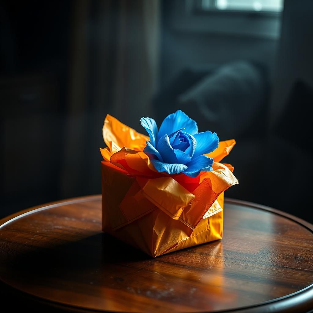 A striking picture of a blue flower nestled among crumpled orange packaging on a dark wood table. Misty lighting enhances the tranquil, luxurious feel of this high-end still life photograph.