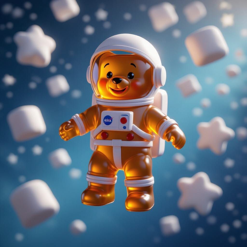 A cute 3D render of a gummy bear astronaut floating in space among marshmallow stars. Features soft lighting, vibrant colors, and a dreamy atmosphere for a high-detail, cinematic look.