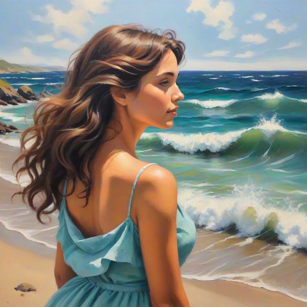 This image shows a woman listening to the ocean. The oil and pastel painting on canvas depicts a figure attuned to the sea, as though hearing personal stories in its waves.