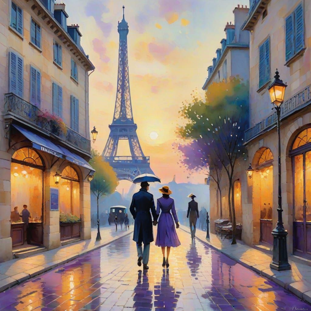 This beautiful watercolor painting captures a loving couple's romantic stroll through a charming old cobblestone alley, set against the iconic Eiffel Tower's warm, golden glow, with soft brushstrokes and vibrant colors creating a captivating and intimate atmosphere.