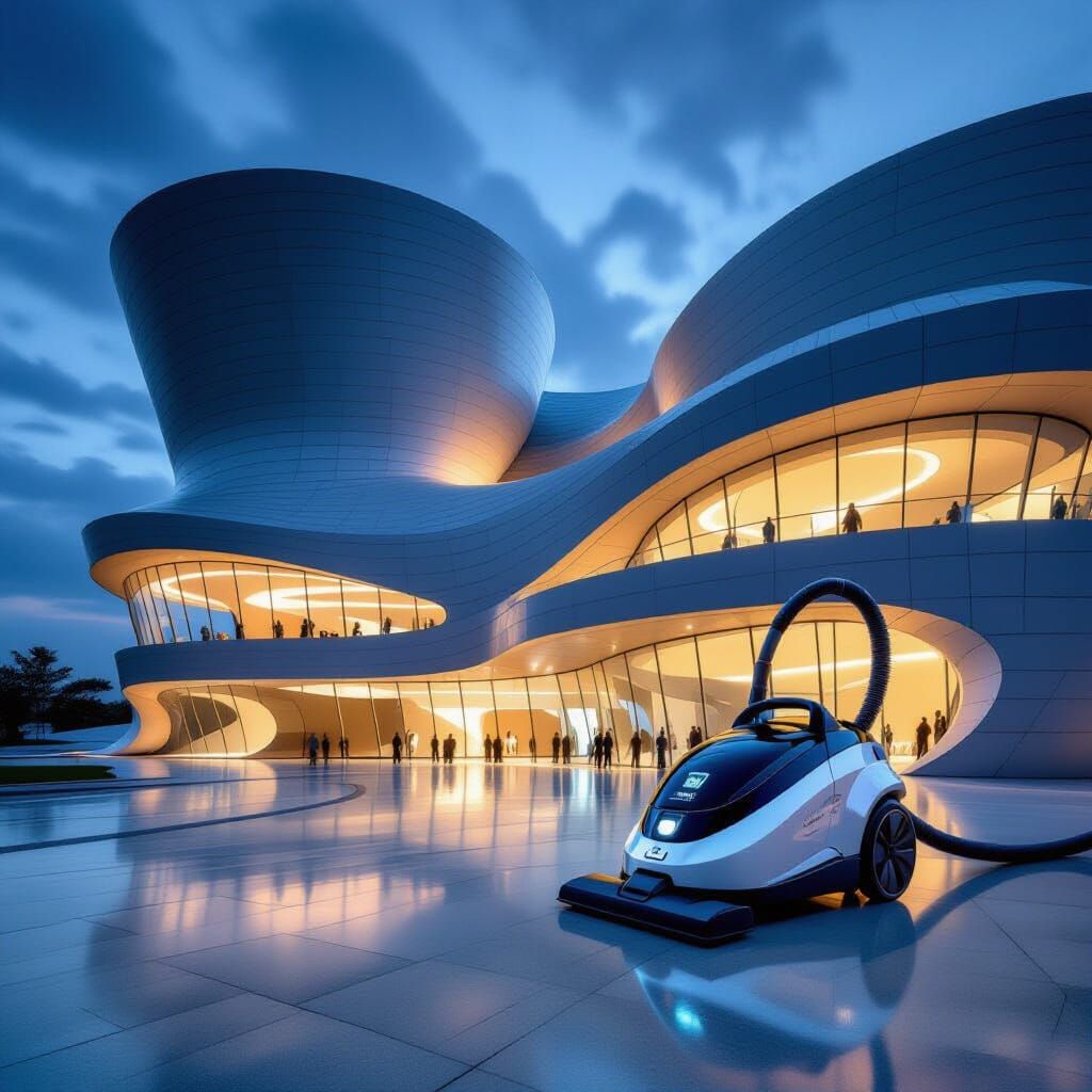 A realistic, surreal artwork blending the Guggenheim Museum's spiral design with a sleek vacuum cleaner. Cinematic lighting highlights the unique, functional art piece.