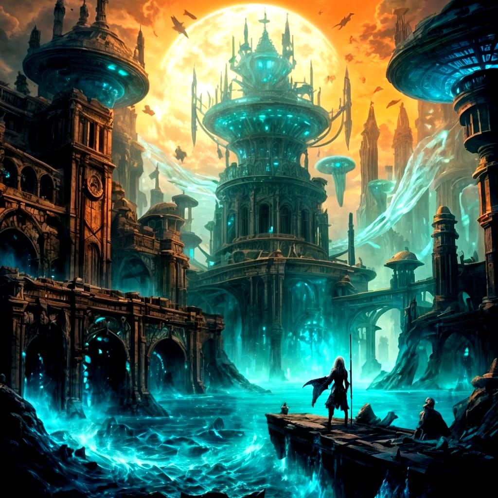 This image shows a majestic mermaid with glowing hair rising from a cosmic vortex above a crystalline coral city. The scene features ethereal light and a blend of fantasy art with mechanical detail.