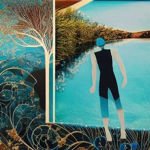 close up on a detail of a swimmer, water clean lines simplicity of form, haiku line art Brooke Shaden Sid Dickens pastels , emotion, beauty, feeling luminous mixed media collage gothic
