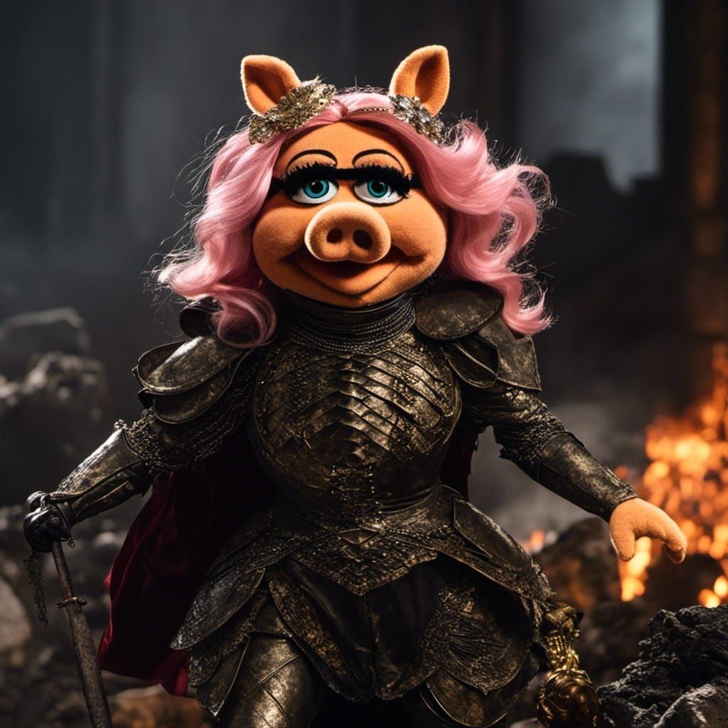 A formidable Dark Souls boss character inspired by Miss Piggy. This image showcases a cartoon muppet puppet reimagined in a dark fantasy aesthetic.