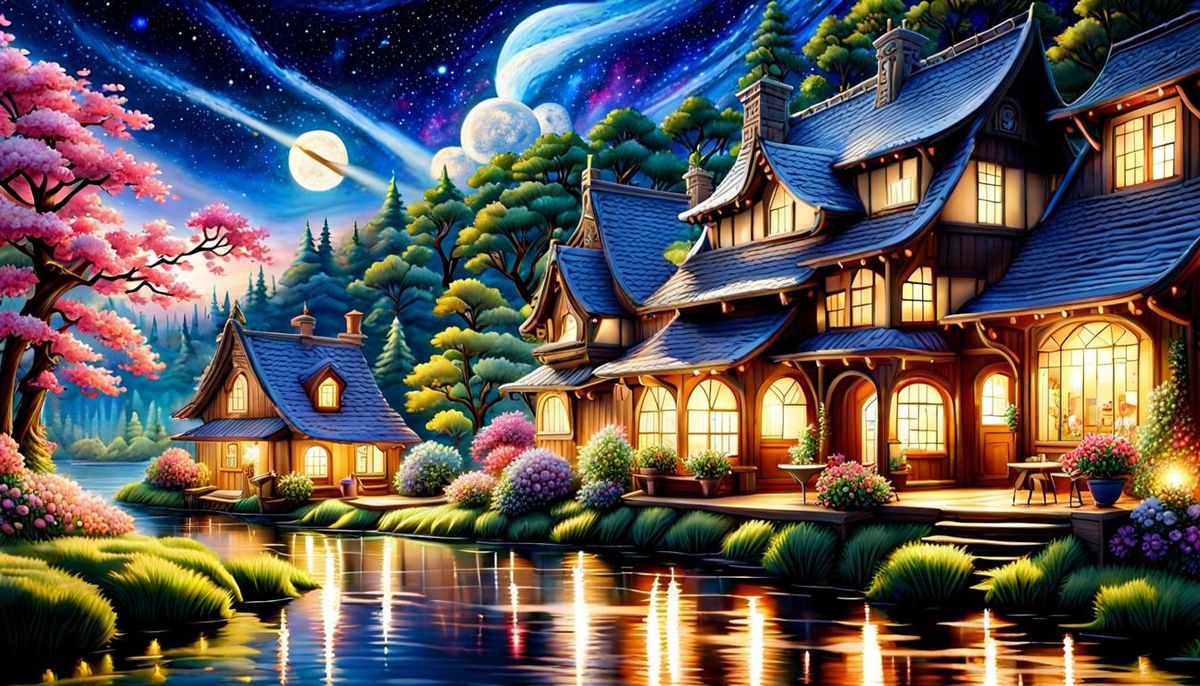 A surreal image shows a cottage in an enchanted wonderland under a starry night. This meticulously detailed fantasy photo evokes film noir with high contrast, reminiscent of gouache and impressionist paintings.
