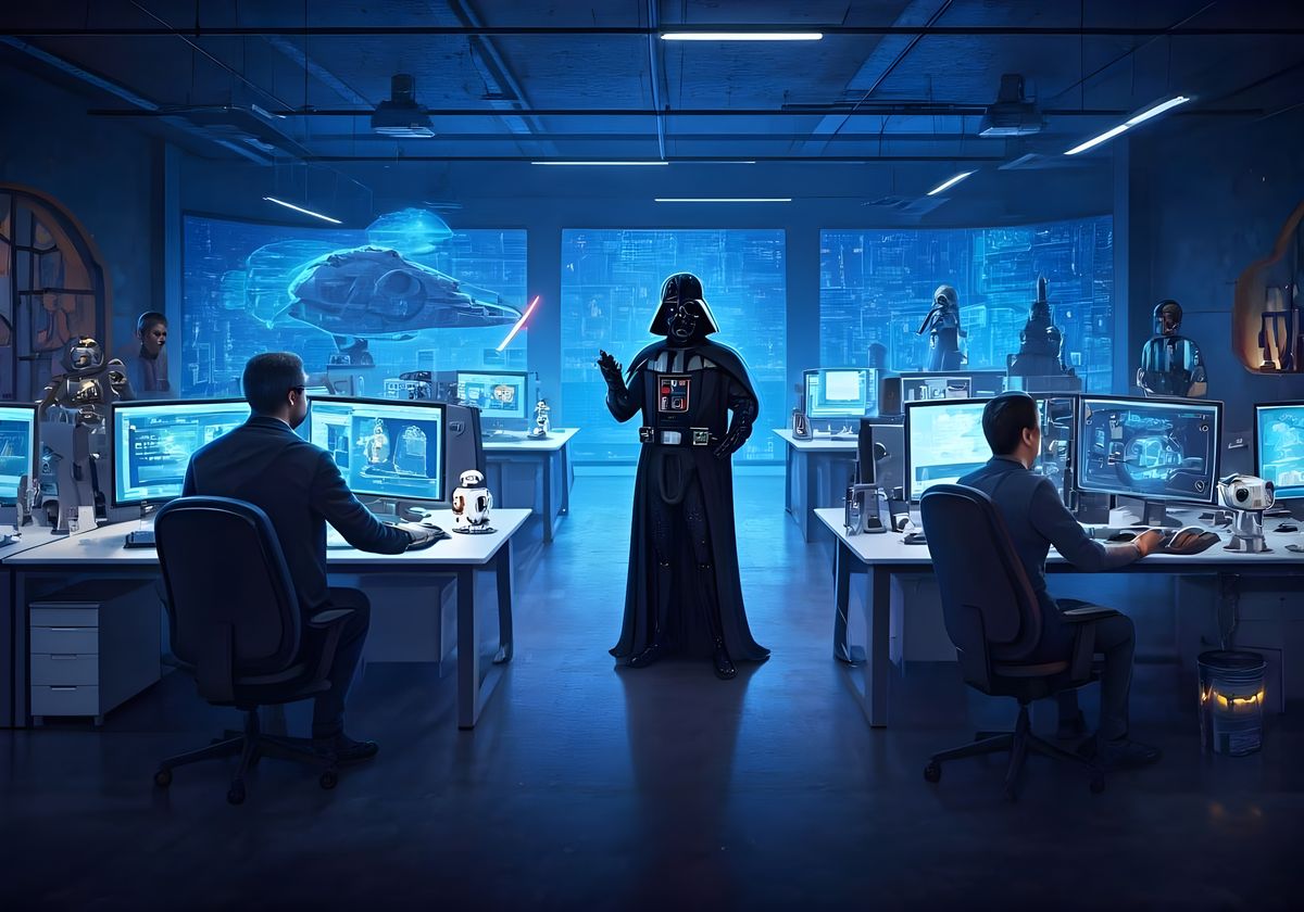 A lively, detailed digital illustration of a modern office celebrating ‘May the 4th’ with a full Star Wars theme. Employees of all backgrounds are dressed as iconic characters like Darth Vader, Leia, Yoda, and stormtroopers, while working at desks decorated with lightsabers, mini droids, and starships. The break room is transformed into the Mos Eisley Cantina with alien-themed snacks and a Wookiee-shaped cake. Holograms of the Death Star and Millennium Falcon float in the air. The atmosphere is joyful, playful, and futuristic—blending corporate office life with epic sci-fi flair. Style: Pixar-meets-realism