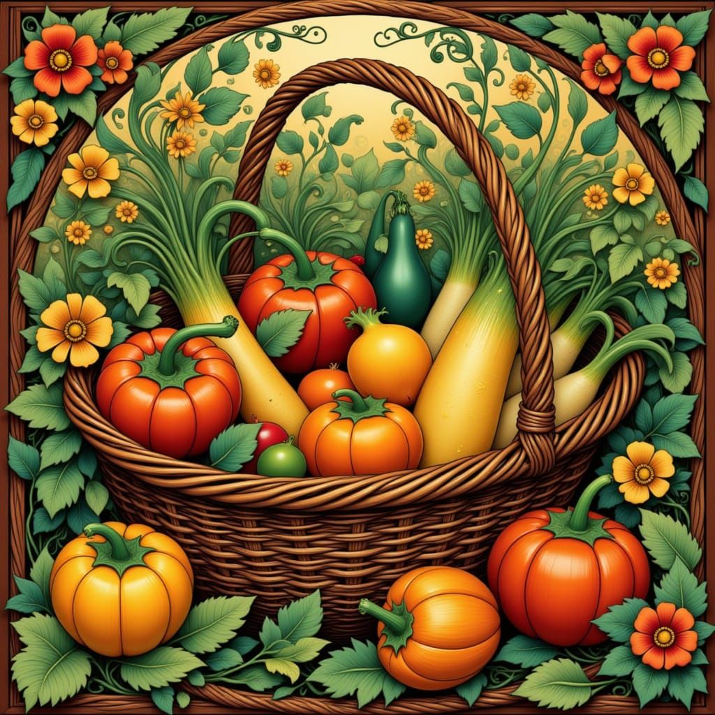 A striking picture of a vegetable still life in a wicker basket, overflowing with lush greenery. The image is rendered in a folk art nouveau style, with intricate patterns and soft lighting.