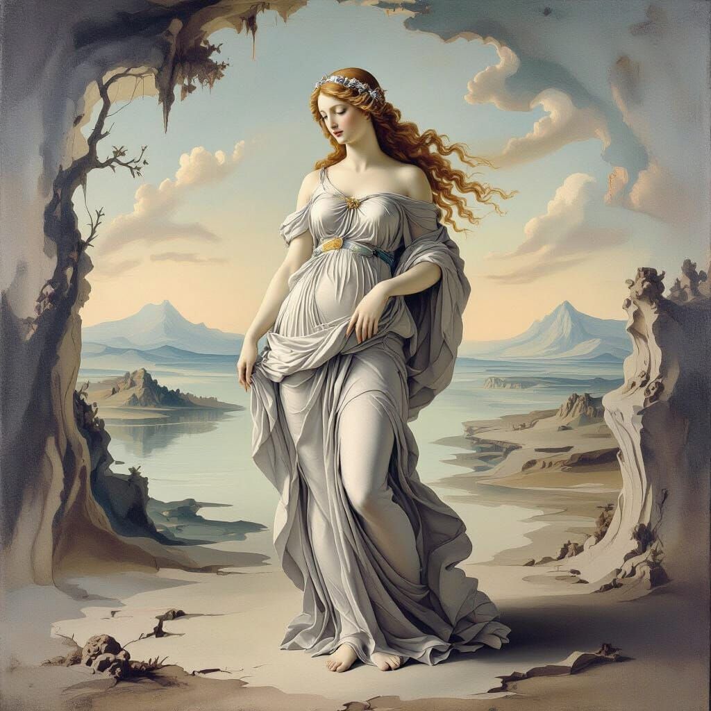 A surreal image of Aphrodite in a toga in a dreamscape. The artwork blends soft pastel watercolors with elements of surrealism, rendered in a textured, oil-on-canvas style.