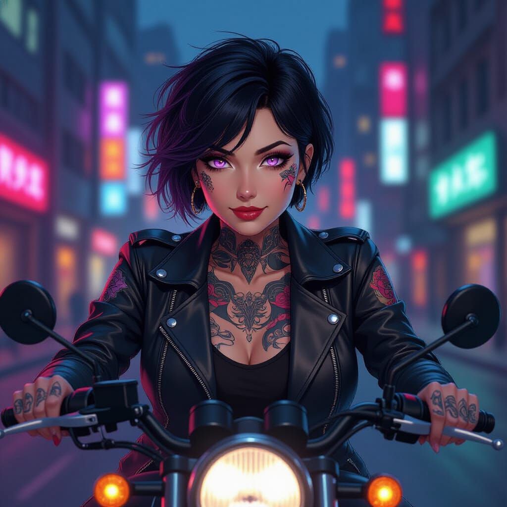 This image shows an elderly woman with lavender eyes and short black hair confidently riding a motorcycle through a neon-lit cityscape. The image blends Art Nouveau portraiture with contemporary pop art elements.