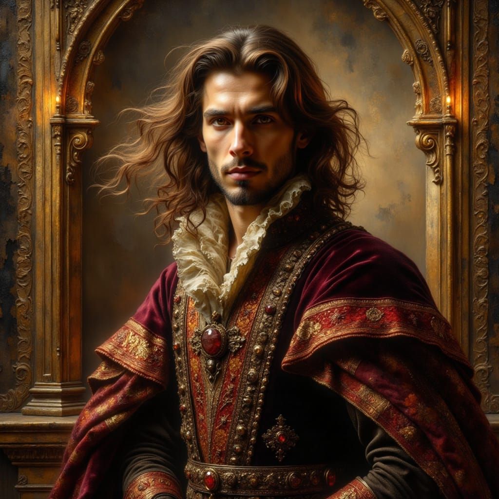 A dramatic portrait of a musketeer in a baroque hall. The image features rich colors and dramatic lighting, reminiscent of a Rembrandt painting, enhanced with metallic textures and rendered as digital matte painting.