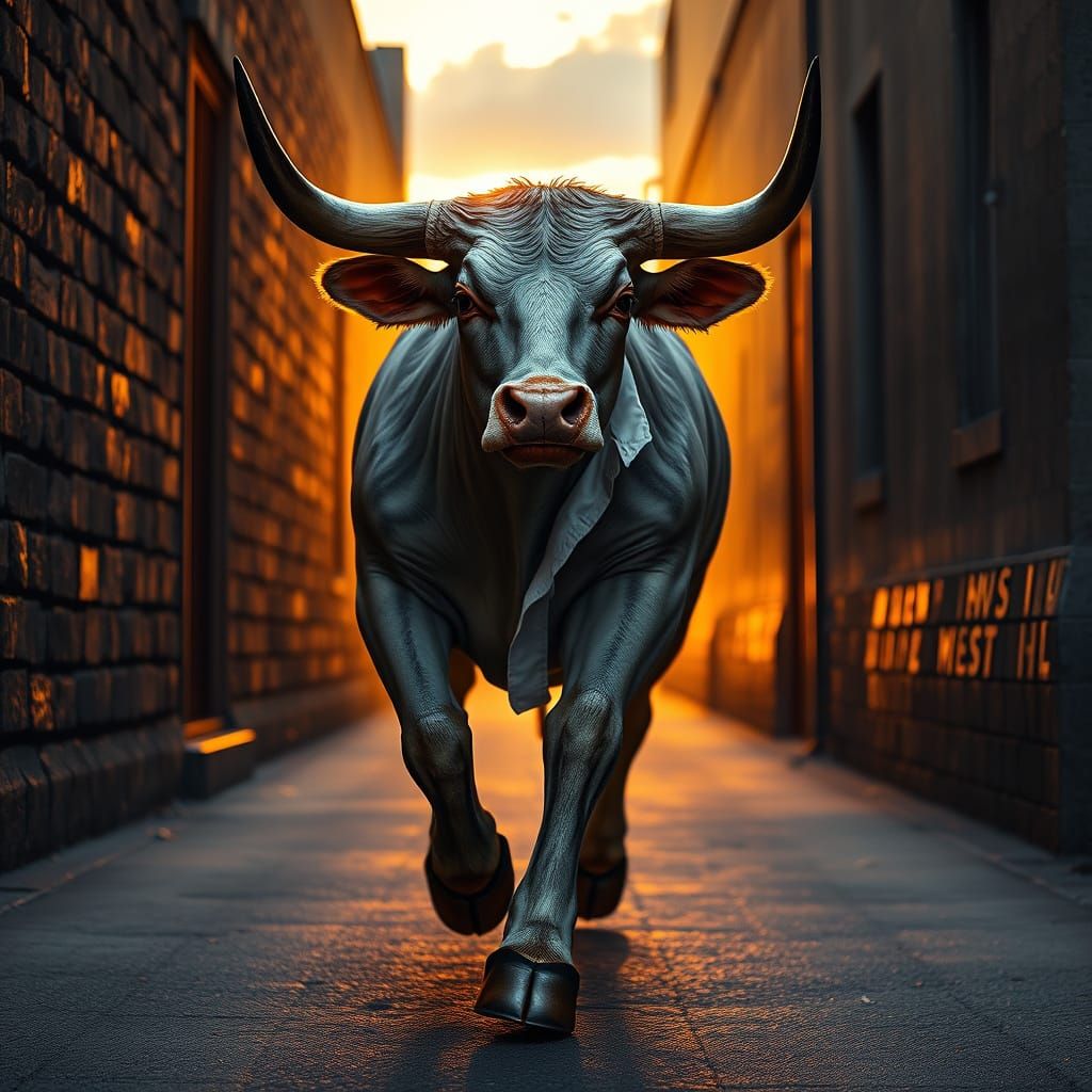 This image shows a bull runner on a walled street during sunset. The scene is rendered with dynamic lighting and intricate details, in a hyperdetailed concept art style with triadic colors.