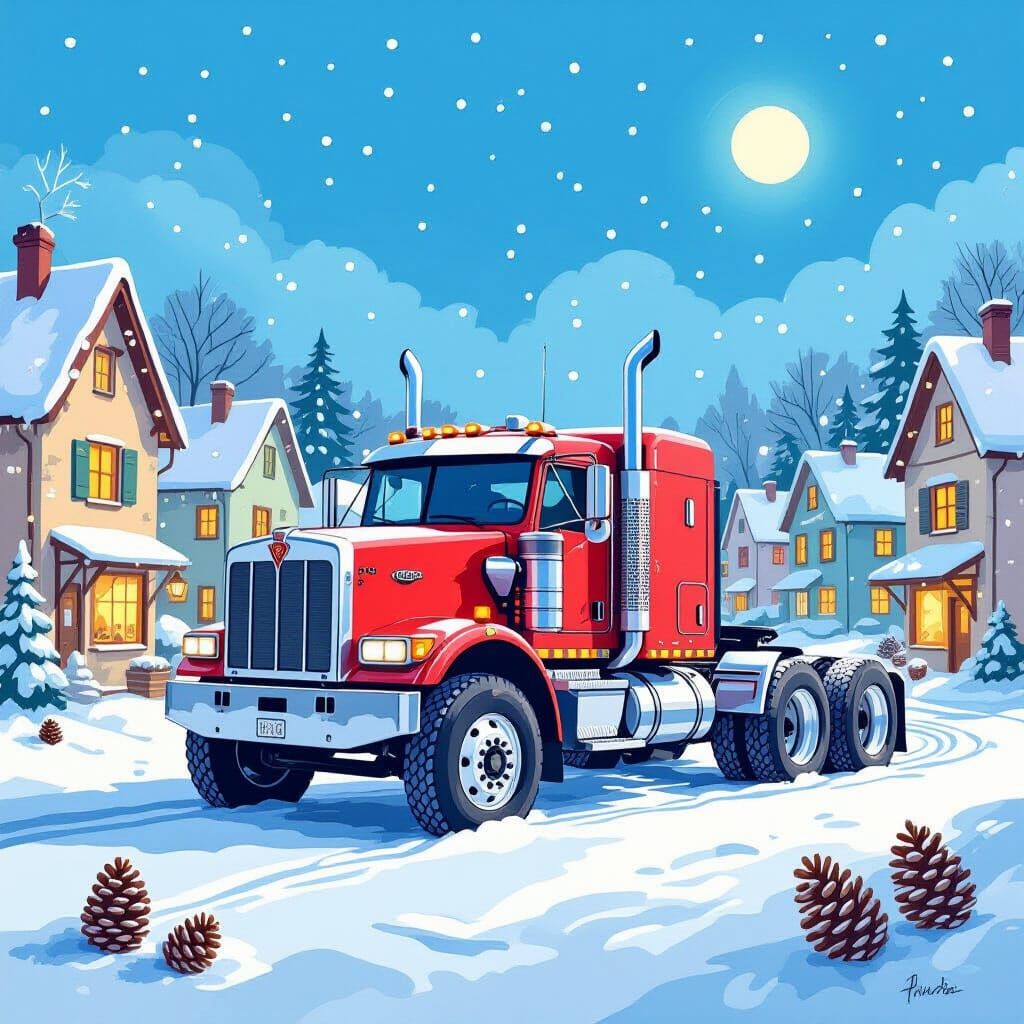 This image shows a tractor truck parked in a snow-covered village square. Houses with fairy lights decorate the scene beneath a bright blue sky in a whimsical watercolor style.