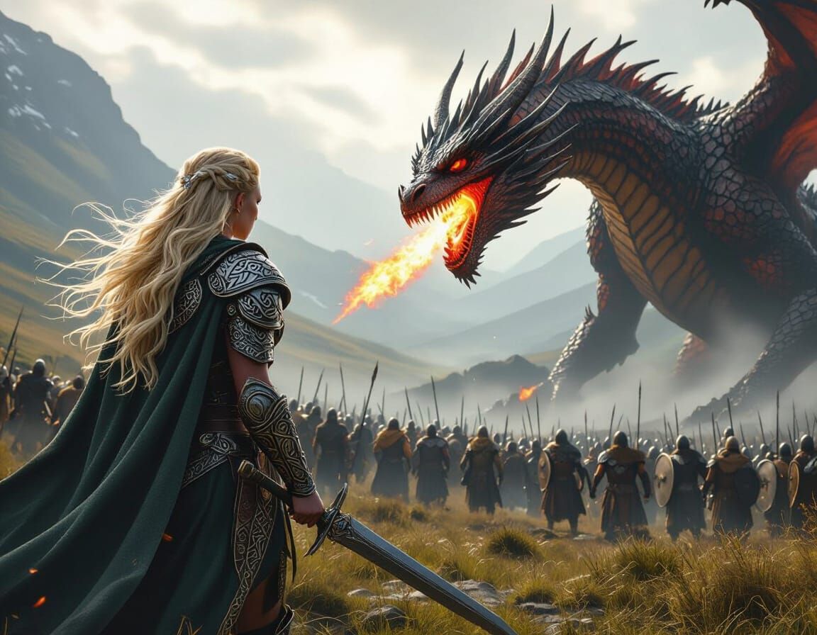 A fierce blond warrior queen, adorned in intricate Irish Celtic knotwork armor, appears to lead her army against a colossal, fire-breathing dragon when in reality, he is their secret weapon.