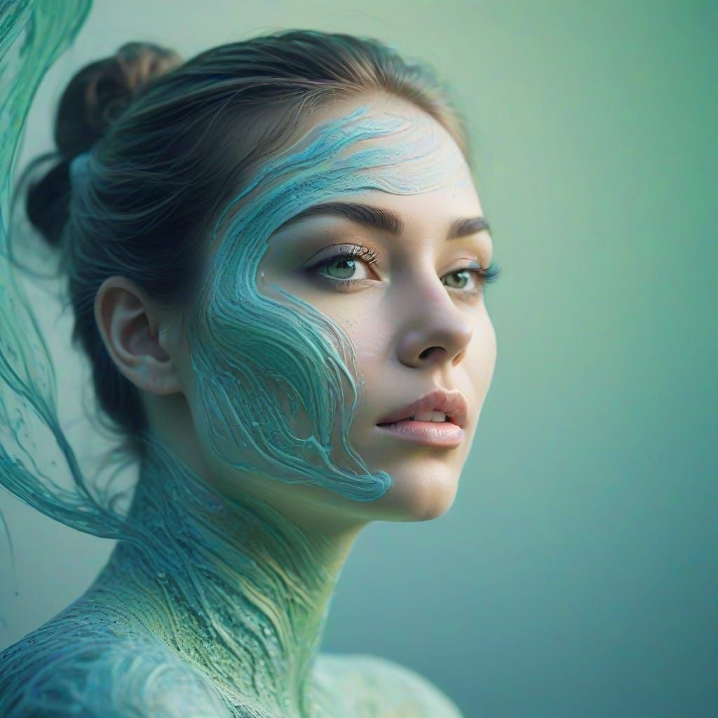 This image shows a person sitting amidst vibrant, swirling patterns of blue and green. The close-up shot, rendered in an expressionist style with shimmering light and a soft pastel gradient, creates a dreamy and surreal aesthetic.