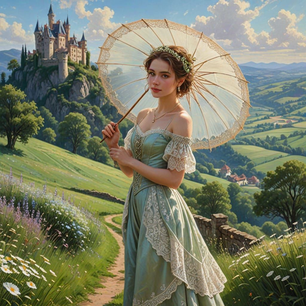 This oil painting captures a young woman in a vintage gown amidst a lush landscape, holding a lace parasol. The scene evokes a romantic, fairytale atmosphere with delicate brushstrokes and soft lighting.