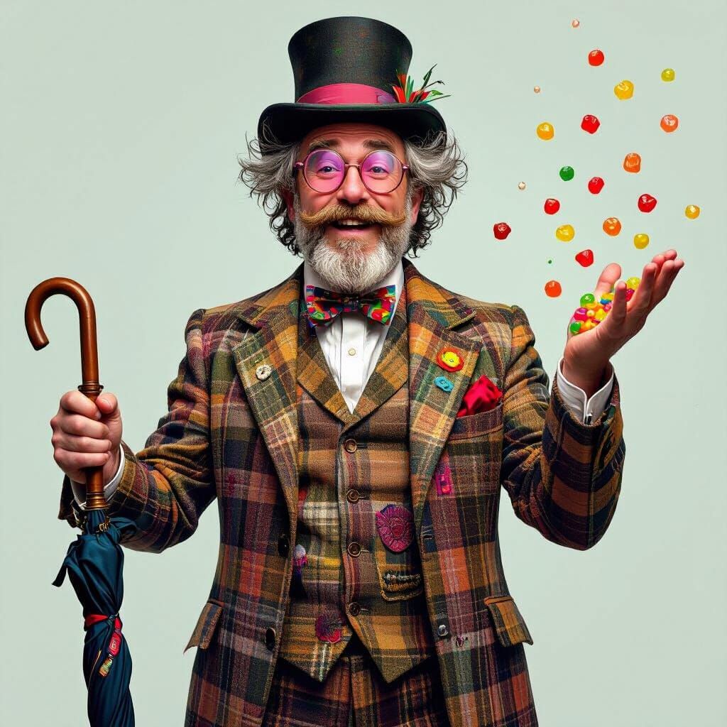 A photorealistic image of a middle-aged gentleman with wild hair and rose-tinted glasses, wearing a colorful tweed suit, top hat, and Wellington boots. He holds an umbrella and throws gummies in a detailed, realistic style.