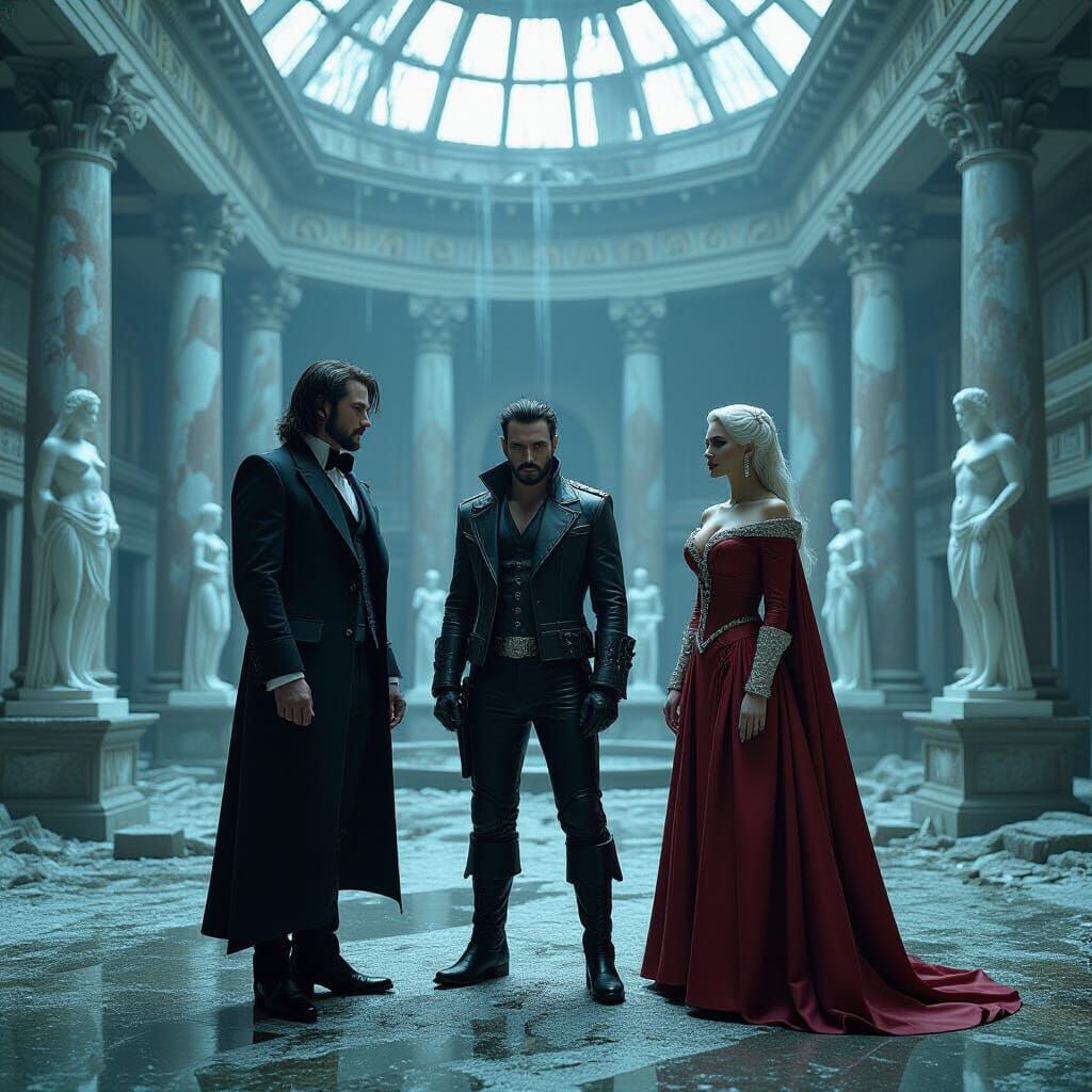 This image shows three men arguing in a decaying underwater city with statues and dripping water. The scene evokes a dystopian futuristic landscape with intense philosophical undertones.