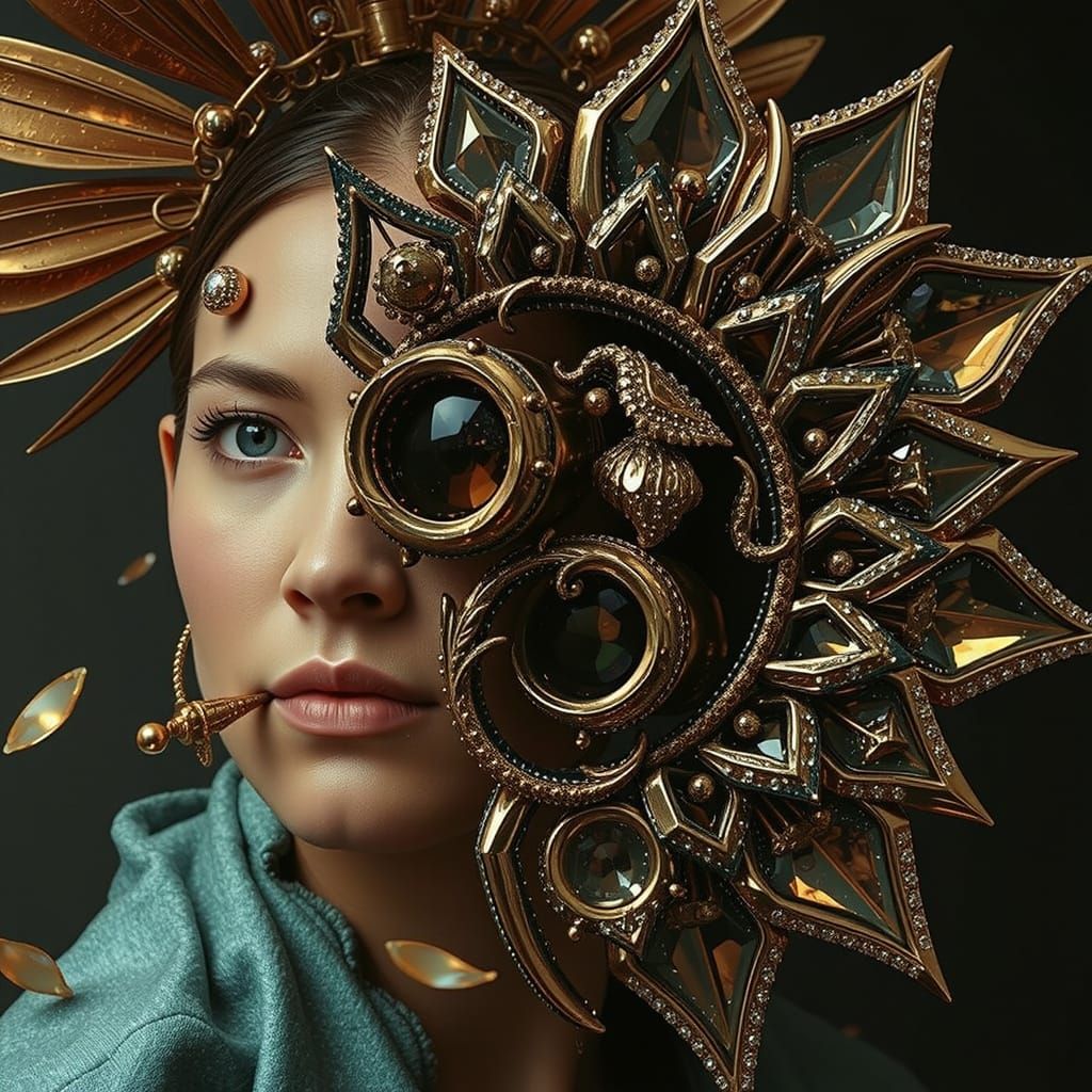 This image showcases AI-generated visuals featuring objects with glittering gold, glass, and glowing elements, evoking a sense of luxury and light.