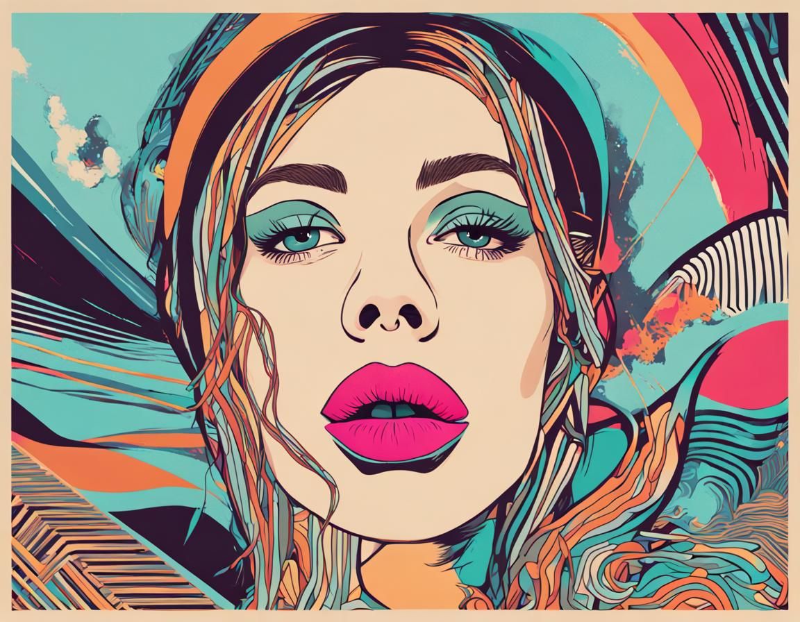 A striking close-up photo of lips painted a vibrant mango color, rendered in a graphic linear style. The high-resolution image mimics photographic techniques, emphasizing bold color.