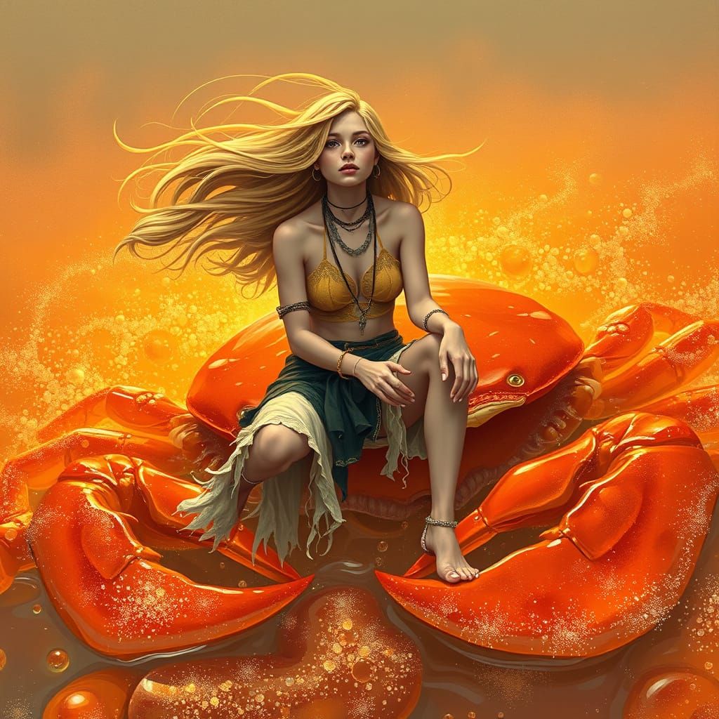 A vibrant image of a young woman with golden hair in bohemian attire, seated atop a large gummy crab in a fizzy sea. The artwork has a neon futuristic aesthetic.