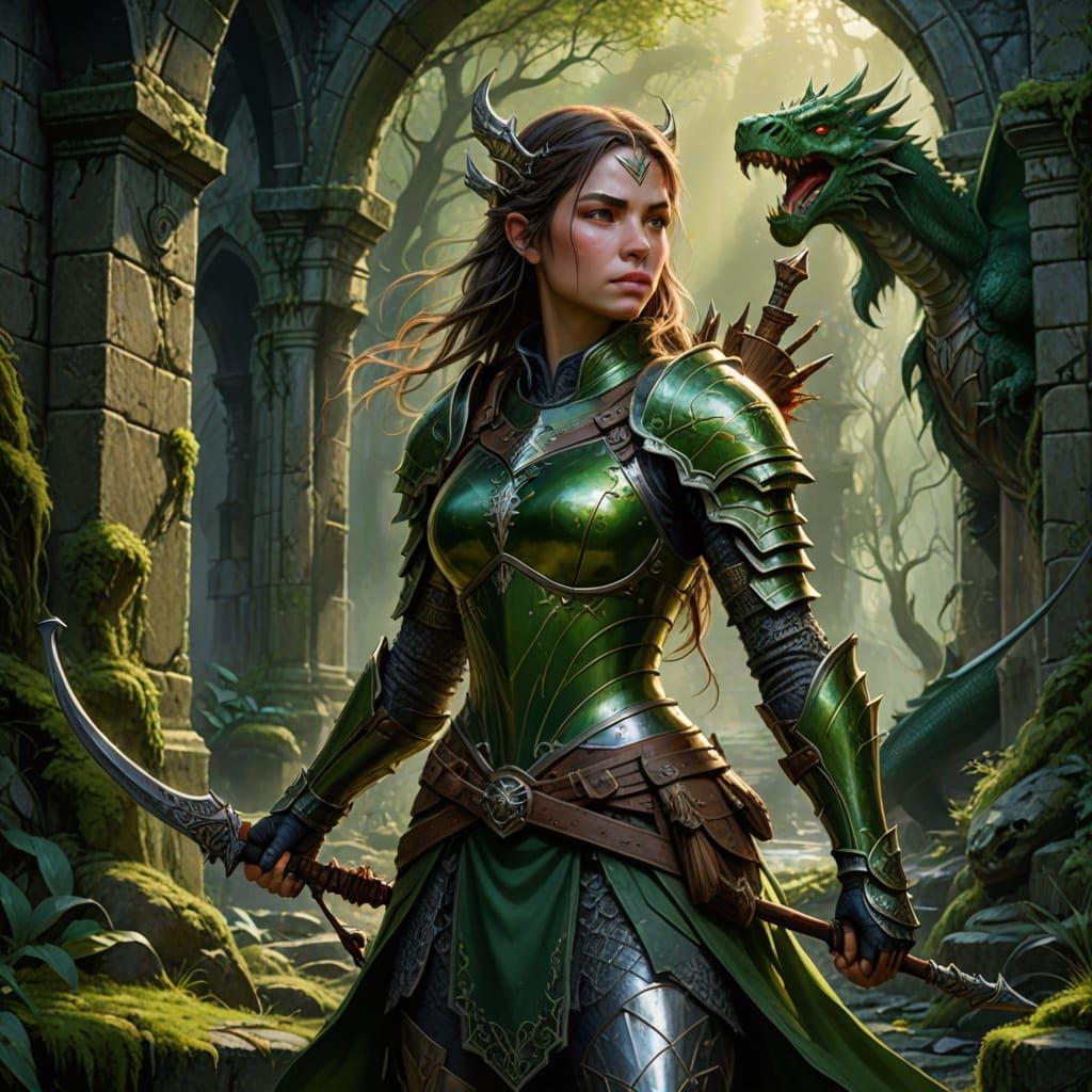 A strong, fantasy female warrior stands in a ruined setting, facing a majestic green dragon head, her serious expression illuminated by dramatic, warm lighting that highlights intricate armor and textures.
