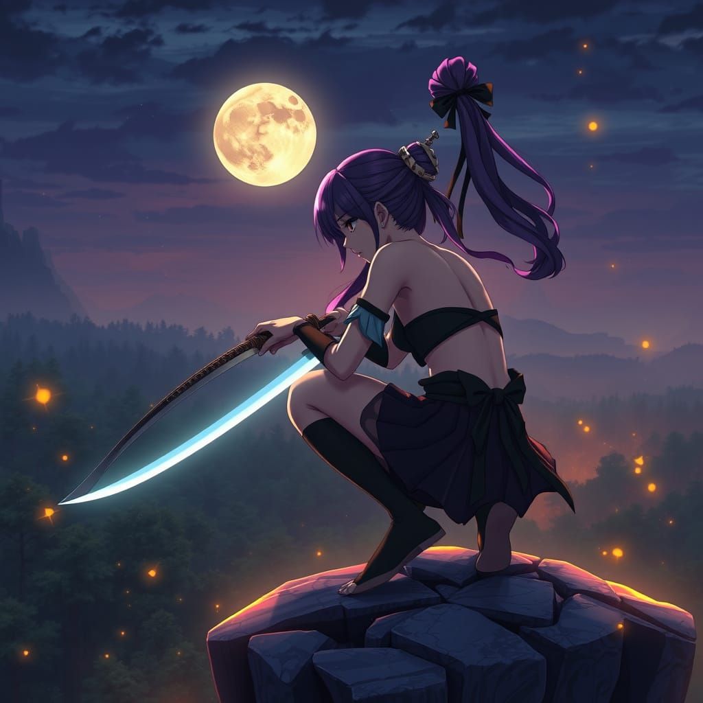 This image shows a fierce anime warrior standing on a glowing cliff at twilight, surrounded by golden fireflies, with a curved moonlit blade in hand, set in a detailed, CGI-fused world.
