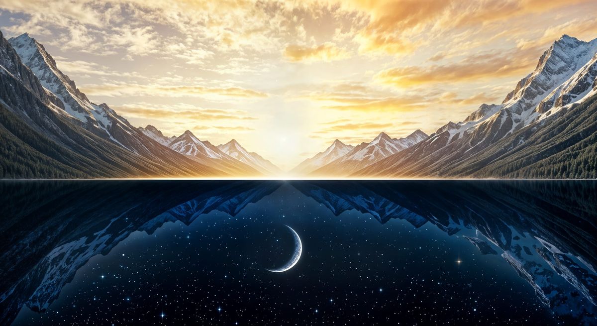 This image shows a surreal landscape where a mountain lake acts as a portal between day and night. The upper half features a golden dawn, while the lower reflects a starlit night in a photorealistic style.