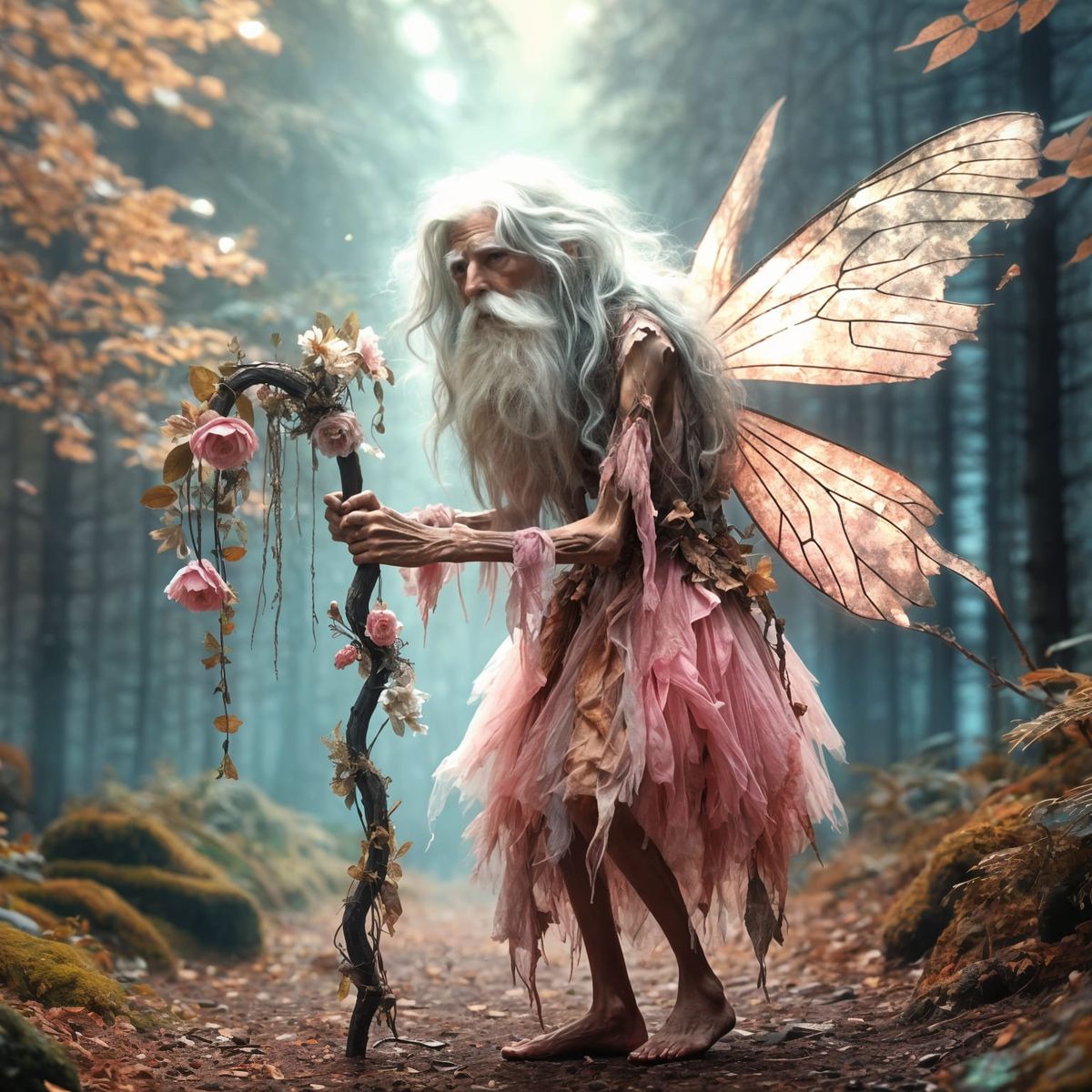 Create a hyper-detailed image representing an elderly fairy. The fairy should have a long, white, messy hair and beard, and should be wearing a tattered pink tutu dress. His wings should be translucent and pink in color. He should be leaning on a twisted wooden staff decorated with flowers. The fairy ...