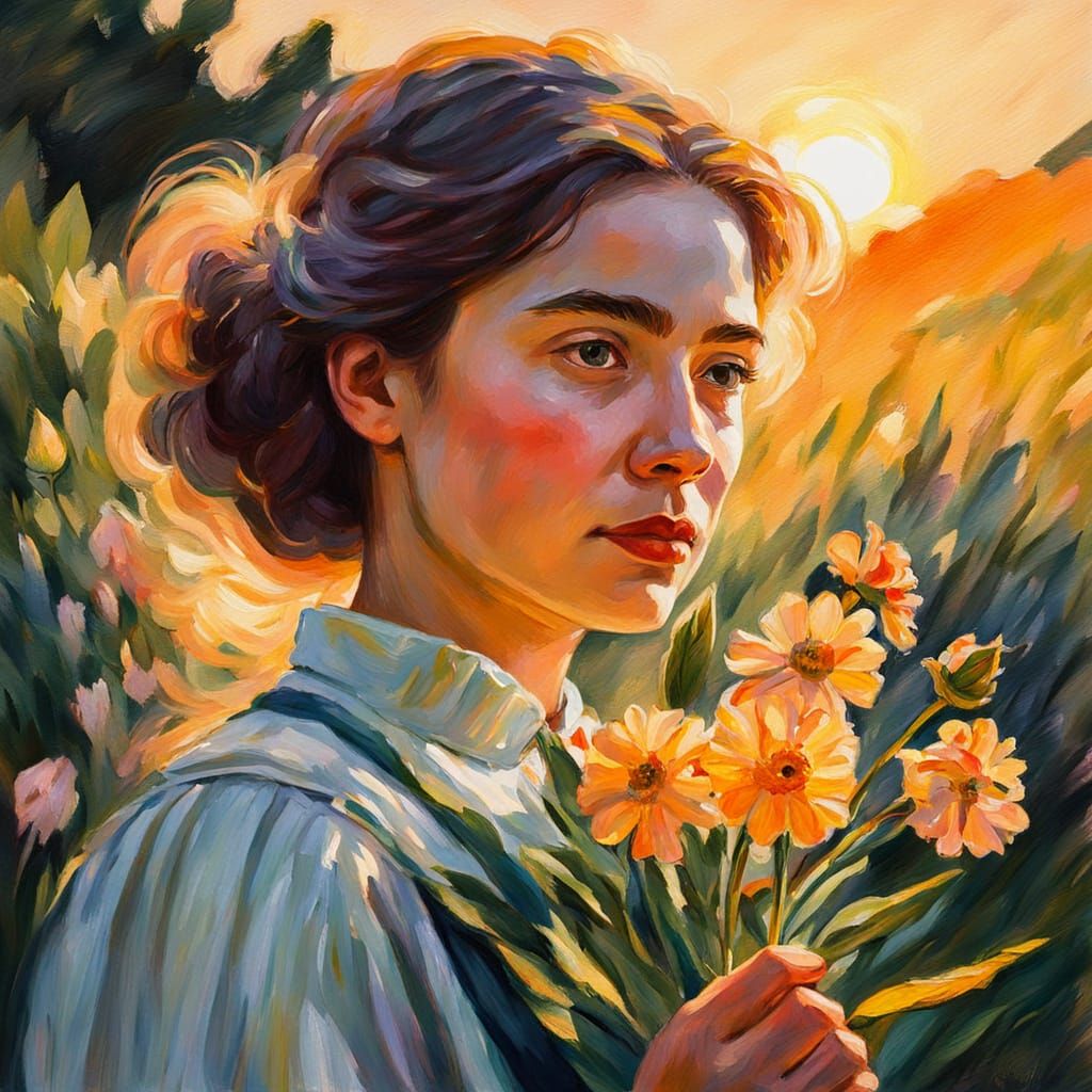 This image shows a woman holding a flower in vibrant gouache style. A close-up, medium shot captures the rich texture and brush strokes reminiscent of impressionist masterpieces.