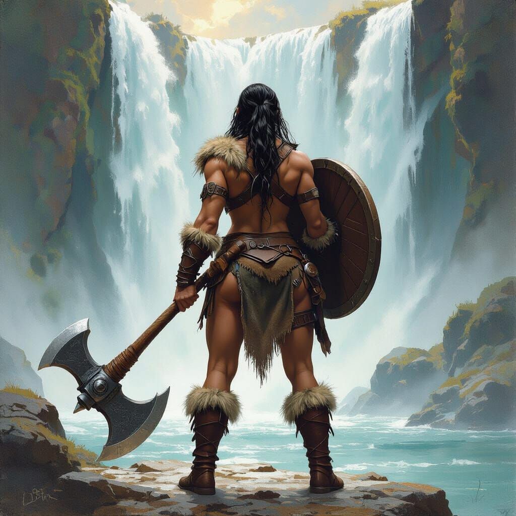 A muscular female warrior stands near a waterfall, holding a large axe and shield. The image evokes a dynamic oil painting style with dramatic lighting and vivid colors.