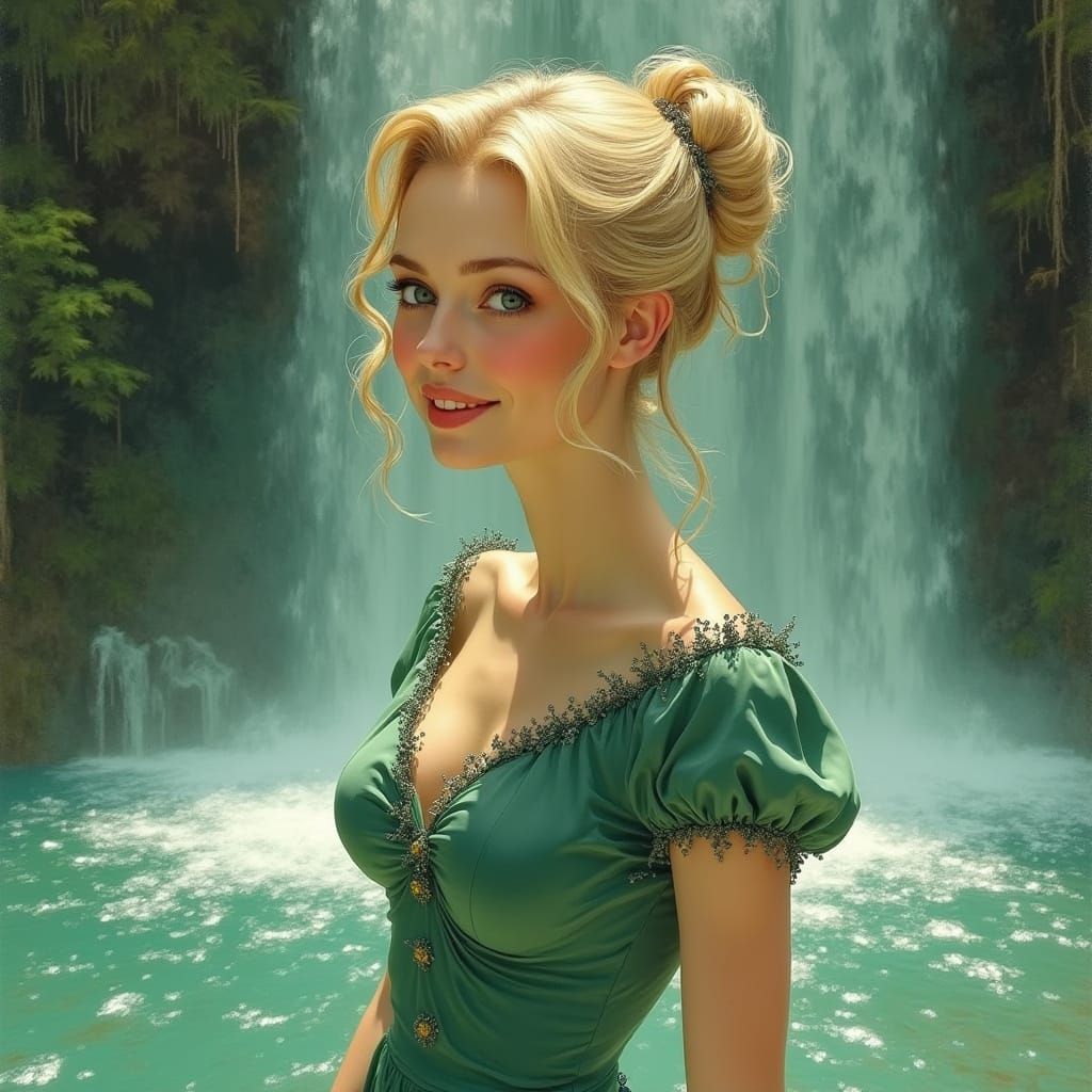 A beautiful European woman with fair skin smiles serenely in front of a waterfall. She wears a pale green dress and her blonde hair is styled in a bun, in an art nouveau style.