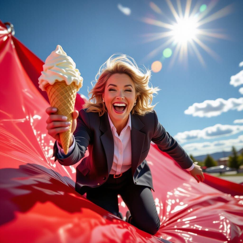 A photorealistic image captures a woman gleefully jumping on a red tarpaulin, holding a vanilla ice cream cone. Bright, sunny lighting and a shallow depth of field enhance the candid, fun moment.