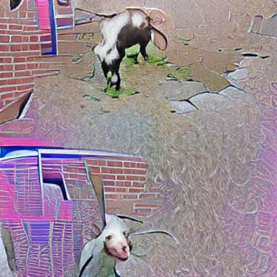 This image depicts what an AI image generator created when given a very simple prompt about a bald goat getting loose.
