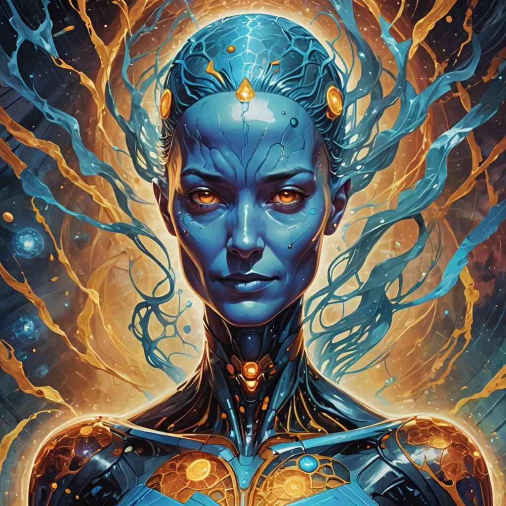 This image shows a digital portrait of Karma Ann Koenig, envisioned as a female Dr. Manhattan. Her smiling face is illuminated by the radiant energy emanating from within her body, depicted in vibrant fractals as modern digital art.