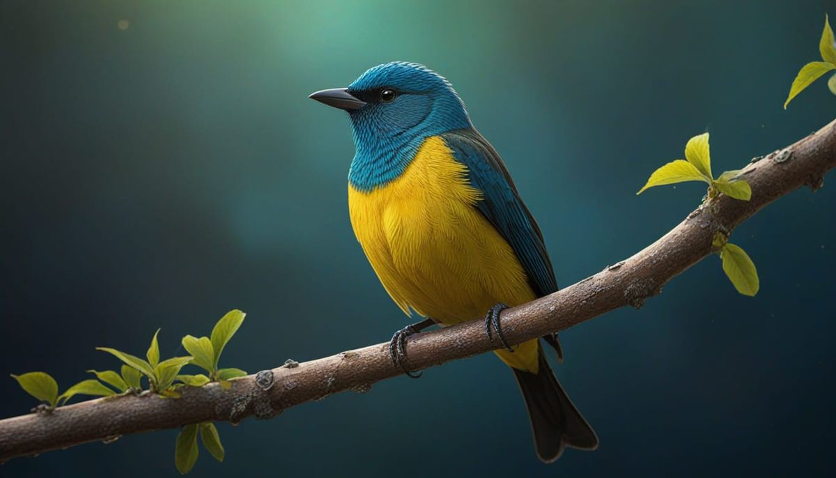 This concept art features a yellow-bellied dacnis with ochre and azure feathers perched on a branch. Intricate detail, dramatic lighting, and vibrant colors create an expressive, hyperrealistic scene.
