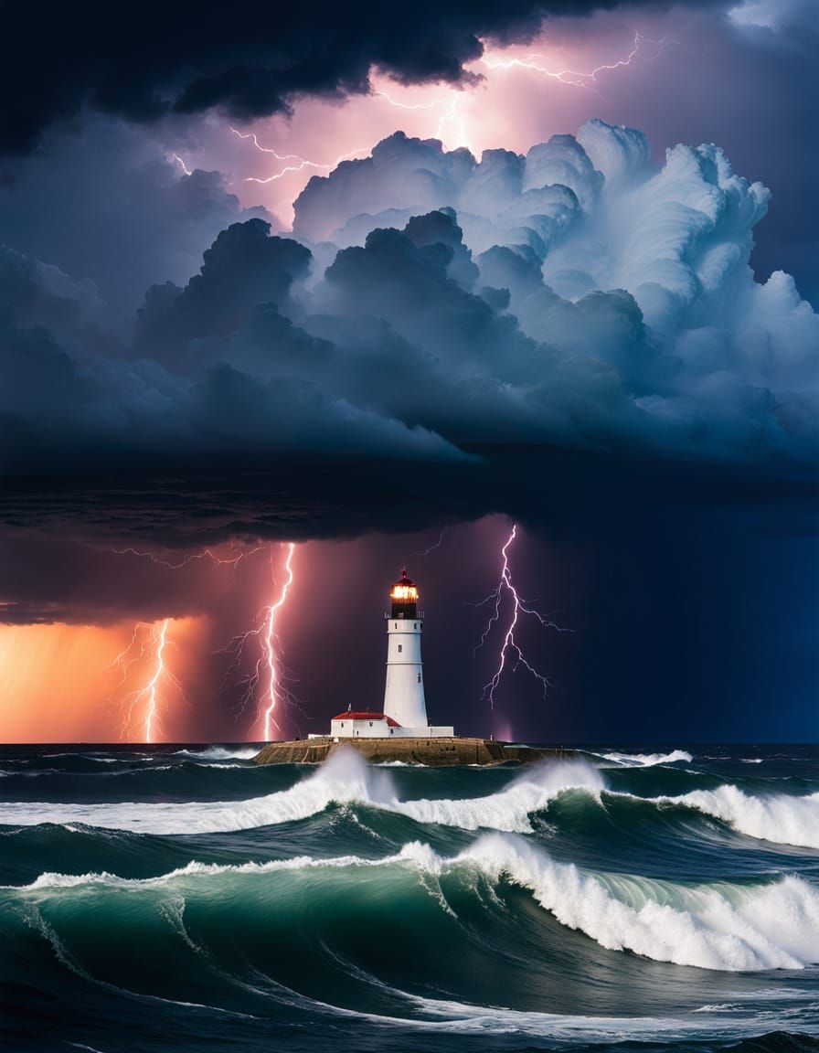 This image shows a prominent lighthouse and a frigate ship battling a stormy sea under a vibrant, lightning-filled sky. The painterly style captures the intense energy of the wild storm.