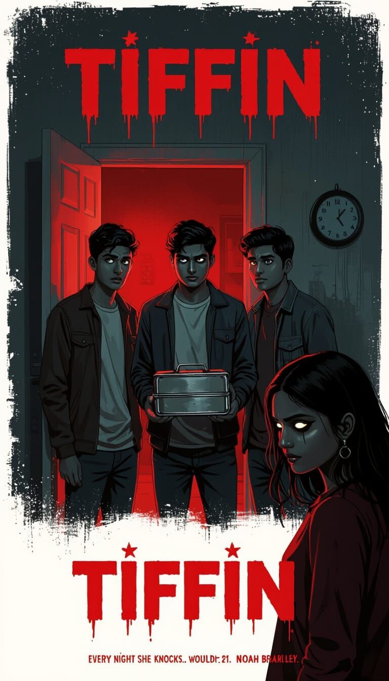A suspenseful image showing three young men in a dimly lit apartment looking scared. A mysterious woman holds a tiffin box in the foreground, with eerie red light and a clock striking 11:30 PM. The artwork has a desaturated, cinematic aesthetic.