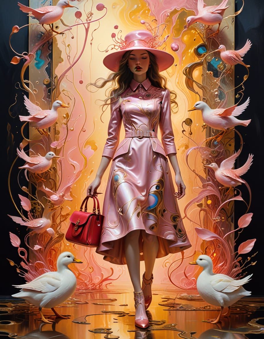 A surrealist painting of a cyberpunk fashion model on a catwalk. The model is wearing all pink and carrying a red duckling, rendered with iridescent textures and golden light in a Dali-esque style.