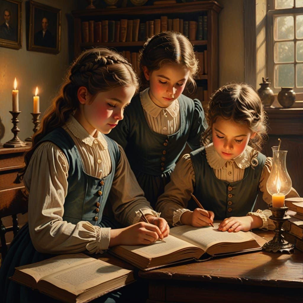 A medium shot of children learning in an 18th-century classroom, rendered as a romantic oil painting. Warm candlelight and soft morning light illuminate the scene, evoking a nostalgic atmosphere.
