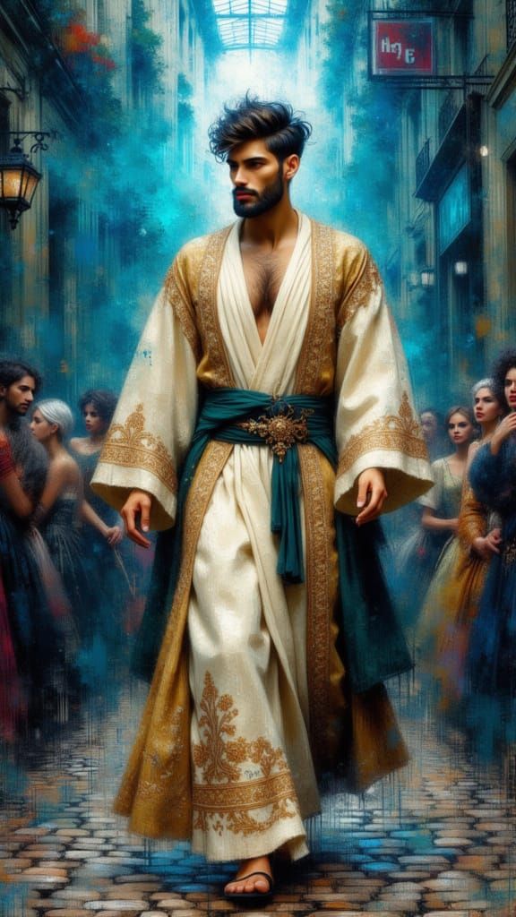 A divine figure in cream robes with gold embroidery walks among people, emitting navy blue and turquoise energy. Rendered in a textured, layered impasto oil style with shimmering hues.