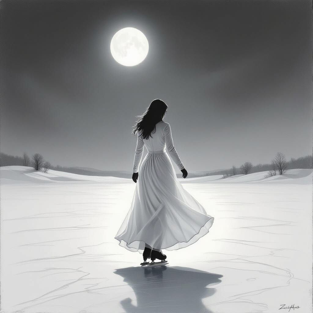 This image shows a solitary figure skating on a frozen landscape under the moonlight. The scene is rendered in monochromatic shades evoking the style of hyperrealistic charcoal drawings.
