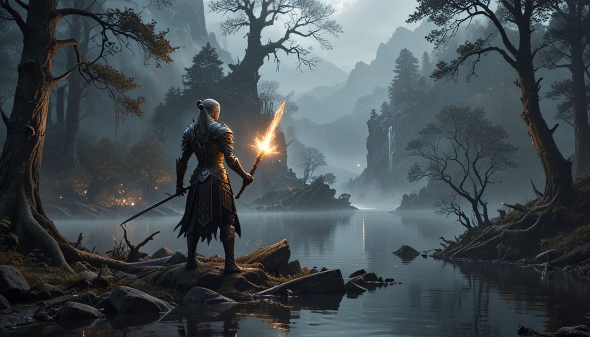 This image shows dark elf cosplayers with stylized elves in black-gold armor near a serene lake. The hyper-realistic digital art features ethereal light, glowing torches, and vibrant textures in a mythical atmosphere.