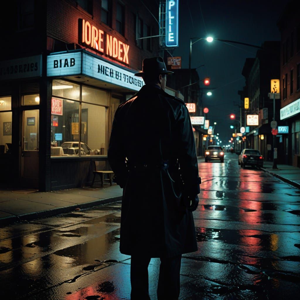 A solitary detective stands under the glow of neon lights on a rainy city street. This image evokes a film noir aesthetic, with high contrast and dramatic shadows.