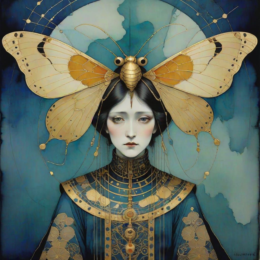 This image shows a surreal moth woman with antennae, rendered in watercolor with kintsugi elements. The artwork evokes symbolism with a touch of surrealism.