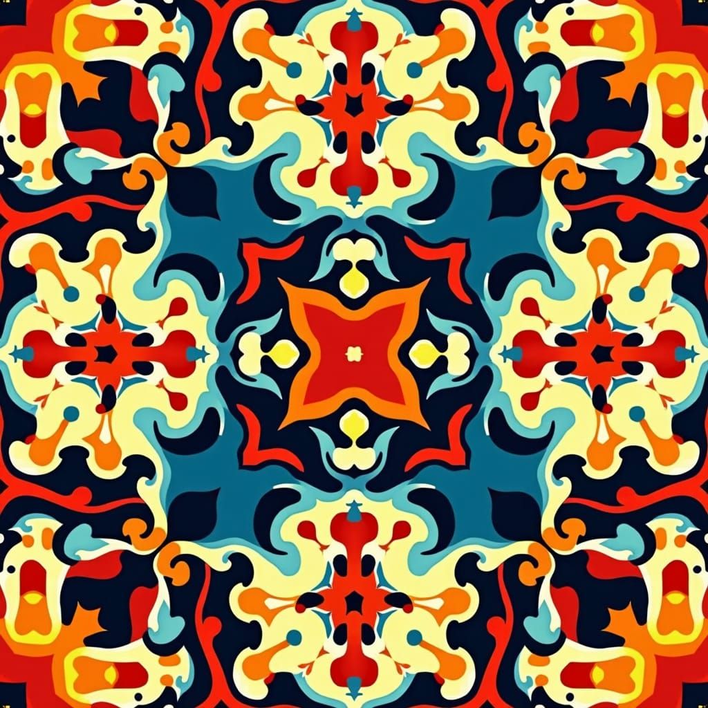 A vibrant and ornate art nouveau pattern designed for seamless repetition. The digital artwork features bold triadic colors and crisp lines reminiscent of 1960s pop art screen prints.