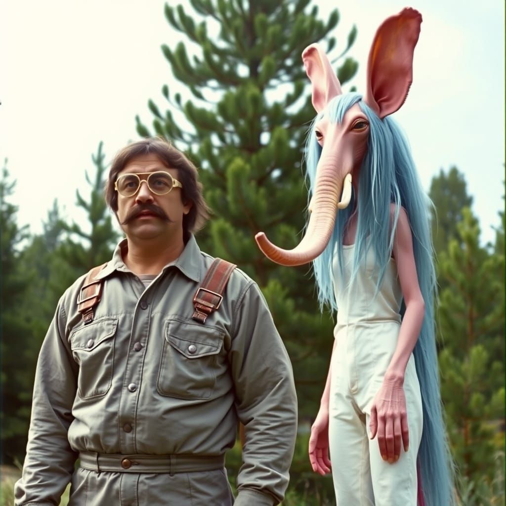 This image depicts a scene from a retro sci-fi movie, featuring a man in a grey jumpsuit with goggles and a large moustache, standing next to a bizarre creature with pink skin, big ears, and blue hair, set against a low-budget B-movie backdrop of a green pine forest.