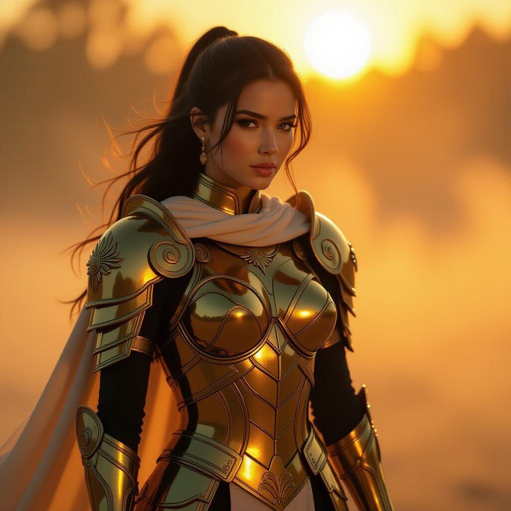 A photorealistic image of a female solar warrior in gleaming golden armor, bathed in warm sunrise light. Cinematic realism with intricate details and volumetric rays.