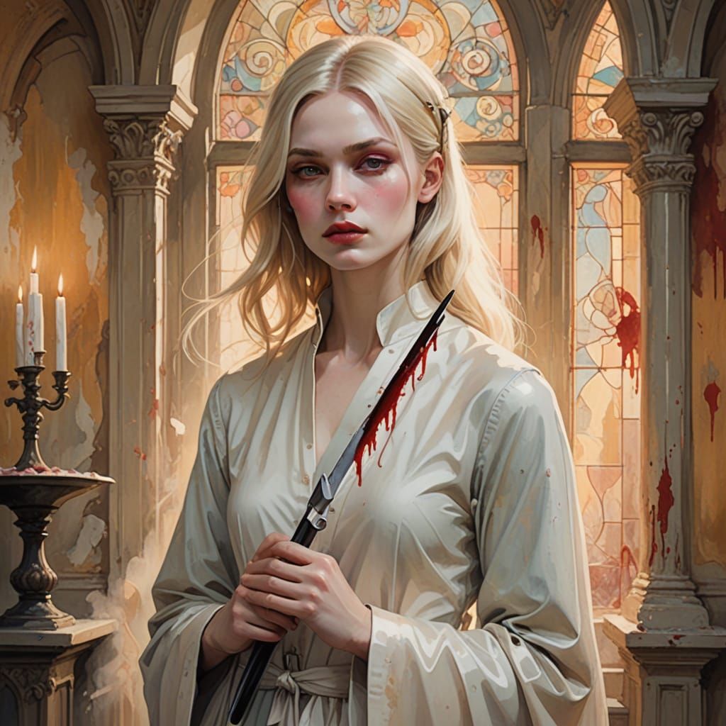 A delicate watercolor painting of a pale woman holding a bloody straight razor in a Gothic-inspired nunnery, set against a warm and golden background with soft focus and pastel colors.