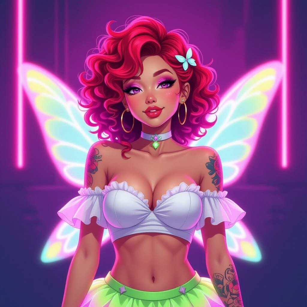 This image shows a vibrant woman in a fairy outfit, posing confidently against pink neon lights. The cel-shaded artwork features dynamic anime aesthetics and a manga-inspired composition.