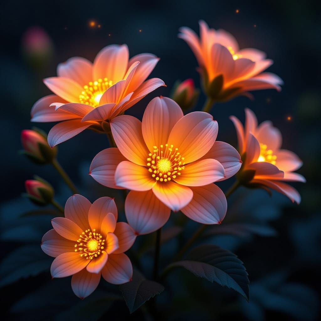 A studio shot of magical, glowing orange and yellow flowers with luminous pollen. The surreal, highly detailed image features ethereal light and vibrant, contrasting colors on a dark background.